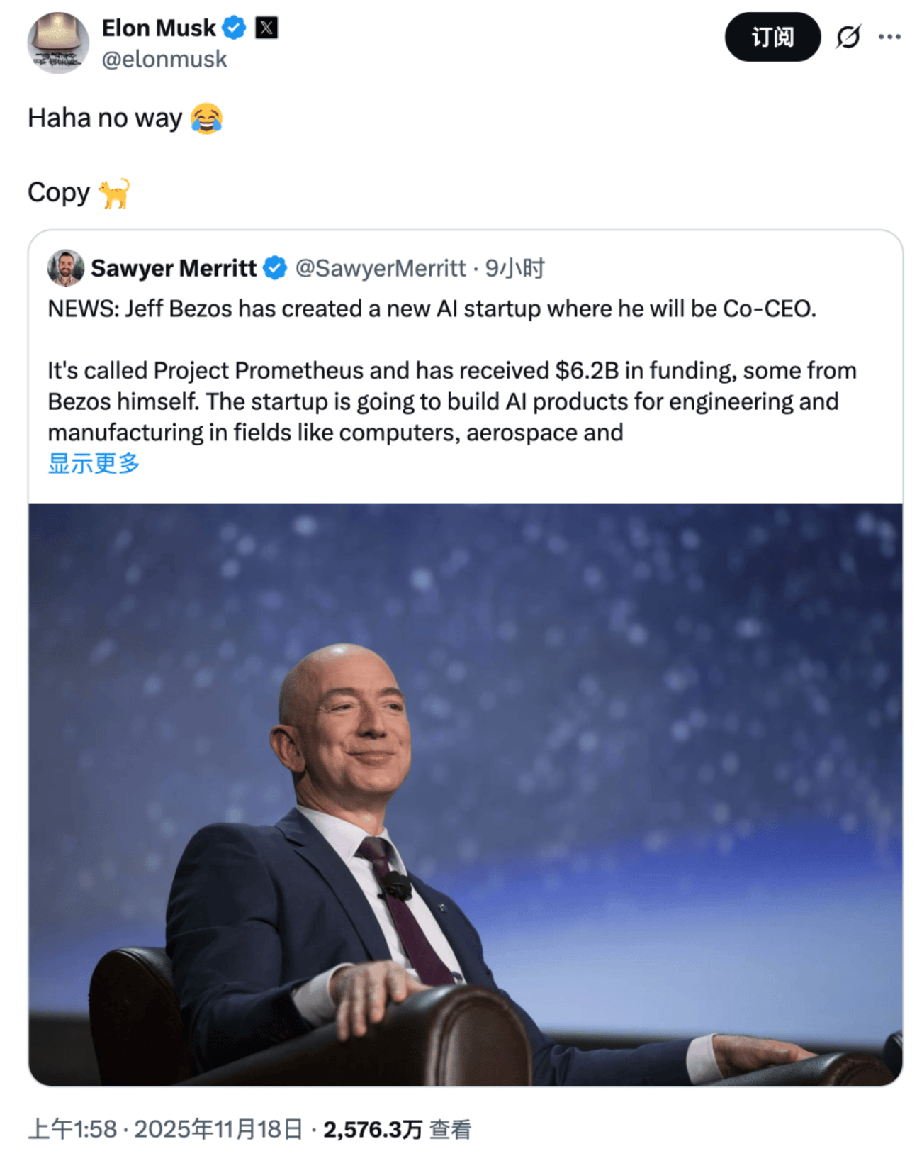 科技圈的“老冤家”又杠上了!這一次,杰夫·貝索斯宣布重返一線創(chuàng)業(yè),計(jì)劃投入62億美元打造“普羅米修斯計(jì)劃”,試圖讓AI從虛擬世界走向現(xiàn)實(shí)。消息剛傳出,埃隆·馬斯克便在社交平臺(tái)X上直接@貝索斯,嘲諷道:“哈哈,不可能。Copy cat(跟屁蟲(chóng))。”兩位科技巨頭的互懟,再次將公眾目光拉回他們長(zhǎng)達(dá)二十年的競(jìng)爭(zhēng)史。