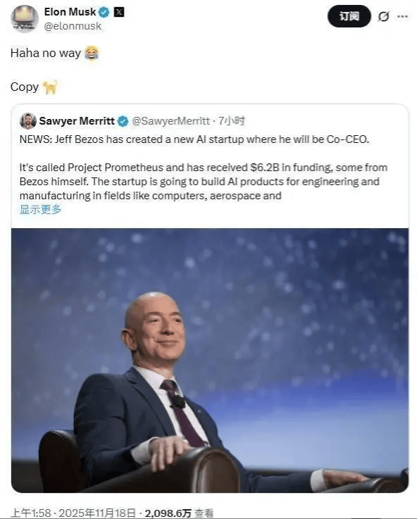 特斯拉與SpaceX首席執(zhí)行官埃隆·馬斯克對(duì)這一動(dòng)向表現(xiàn)出明顯質(zhì)疑。他在社交媒體回應(yīng)稱(chēng):“哈哈,不可能。Copy cat(跟風(fēng)者)。”這一表態(tài)折射出兩位科技巨頭間的競(jìng)爭(zhēng)態(tài)勢(shì)。此前馬斯克曾多次公開(kāi)批評(píng)亞馬遜在AI領(lǐng)域的布局,此次互動(dòng)進(jìn)一步加劇了行業(yè)對(duì)兩大陣營(yíng)對(duì)立的關(guān)注。