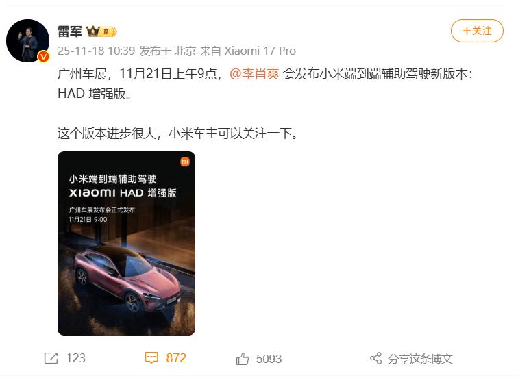 雷軍官宣!小米端到端輔助駕駛HAD增強版11月21日廣州車展亮相