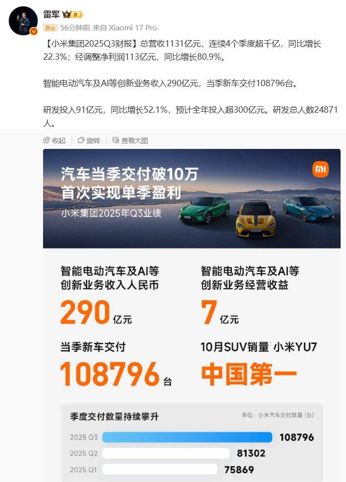 小米集團董事長雷軍通過社交媒體平臺發布消息稱,2025年第三季度集團總營收1131億元,連續四個季度超千億元,經調整凈利潤同比增長80.9%。他特別提到,智能電動汽車及AI創新業務收入達290億元,當季新車交付量為108796臺。