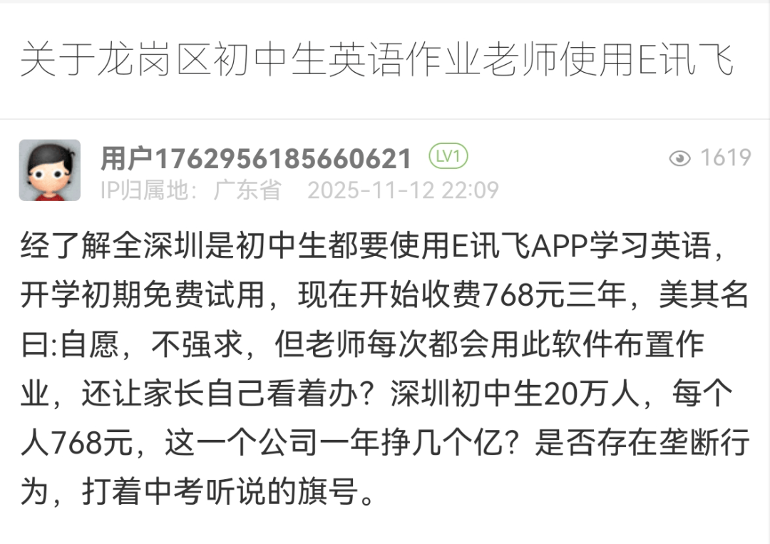 近日,有市民通過《問政深圳》平臺反映,龍崗區(qū)某初中要求學(xué)生使用一款收費APP完成英語作業(yè),引發(fā)家長對收費合理性的質(zhì)疑。盡管校方稱使用該軟件為自愿原則,但家長指出教師頻繁通過該平臺布置任務(wù),且768元的年費對于深圳龐大的初中生群體而言負(fù)擔(dān)較重,同時懷疑相關(guān)企業(yè)存在市場壟斷行為。