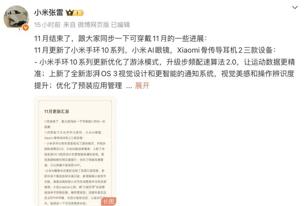 在智能穿戴領(lǐng)域,小米集團(tuán)同步更新了多款產(chǎn)品。11月已推出小米手環(huán)10系列、小米AI眼鏡及Xiaomi骨傳導(dǎo)耳機(jī)2,12月還將迎來(lái)新一輪升級(jí)。小米手環(huán)9新版本將搭載OS3系統(tǒng),界面設(shè)計(jì)煥新,優(yōu)化焦點(diǎn)通知展示效果與系統(tǒng)流暢度,新增運(yùn)動(dòng)異常提示、數(shù)據(jù)保存及GNSS引導(dǎo)頁(yè)面優(yōu)化,步頻配速算法升級(jí),并支持隱藏預(yù)裝應(yīng)用與YU7 NFC車(chē)鑰匙功能。