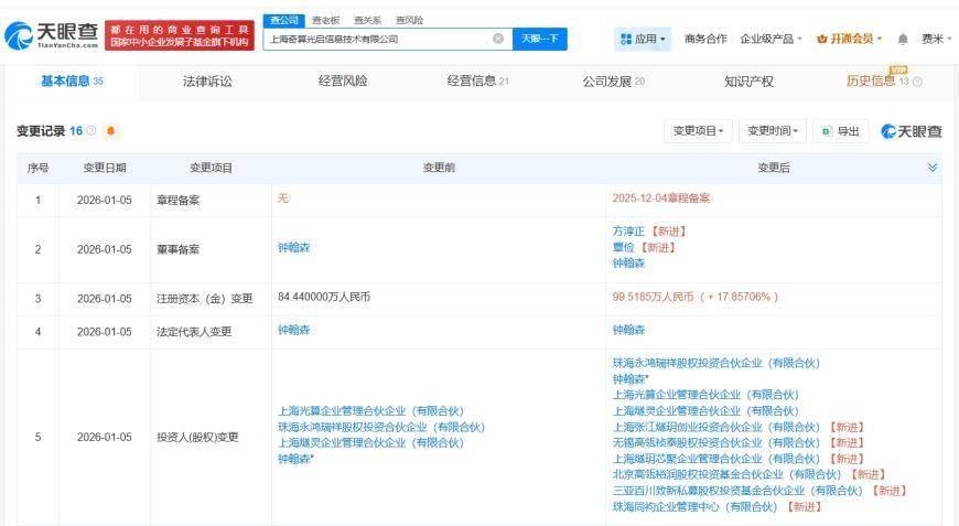 近日,上海奇算光啟信息技術有限公司完成新一輪工商變更,注冊資本從約84.4萬元增至約99.5萬元,同時引入多家知名投資機構作為新股東。新增股東包括百度旗下三亞百川致新私募股權投資基金合伙企業(有限合伙)、上海張江燧玥創業投資合伙企業(有限合伙)以及無錫高瓴禎泰股權投資合伙企業(有限合伙)。此次變更后,公司股東結構進一步多元化,涵蓋創始團隊、企業管理合伙企業及多家戰略投資者。