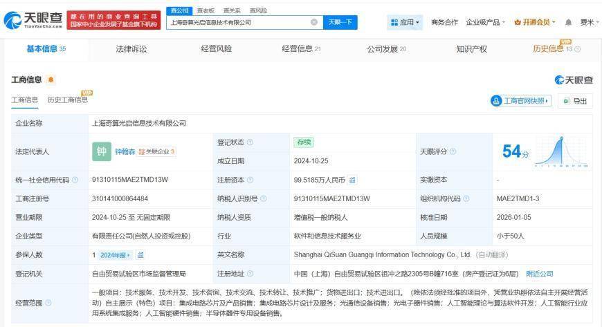 公開資料顯示,上海奇算光啟成立于2024年10月,法定代表人為鐘翰森,核心業務聚焦于光計算芯片領域。公司致力于通過技術創新突破傳統電子芯片的算力限制,為人工智能、高性能計算及大數據處理提供硬件層面的顛覆性解決方案。其經營范圍涵蓋人工智能行業應用系統集成、人工智能硬件銷售以及半導體器件專用設備銷售等領域,顯示出技術驅動與市場應用并重的發展策略。