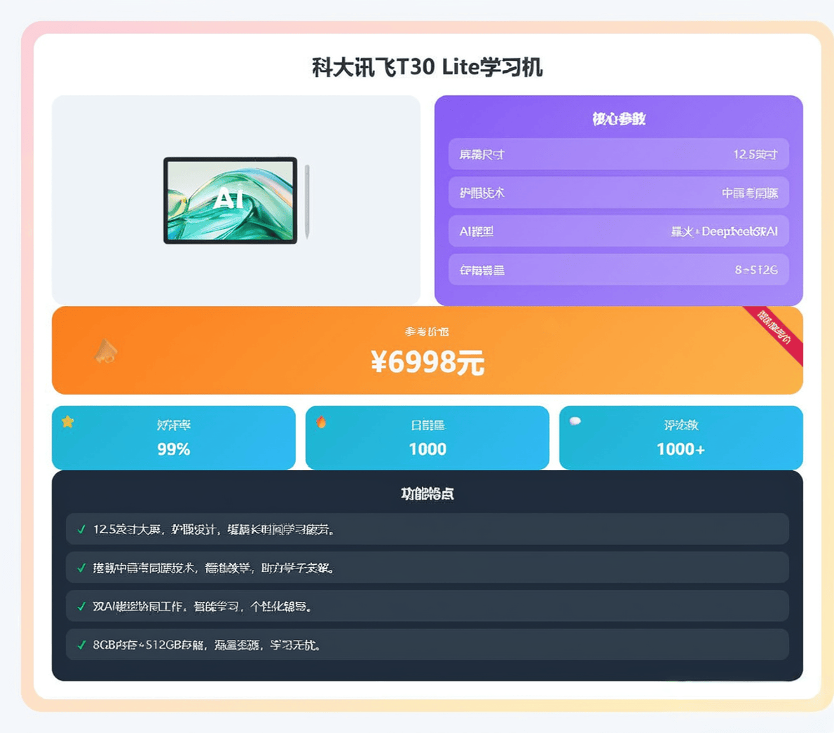 高端市場呈現差異化競爭格局。1.1萬元的T30 Ultra配備14英寸120Hz高刷屏,搭載驍龍8系列處理器與12GB+512GB存儲,其硬件配置達到平板設備頂級水準。而9300元的T30 Pro則在AI算法與屏幕素質上實現升級,新增手寫筆優化與多模態交互功能。這兩款機型更適合對設備性能有極致追求的家庭,但需注意其核心學習功能與標準版差異有限。