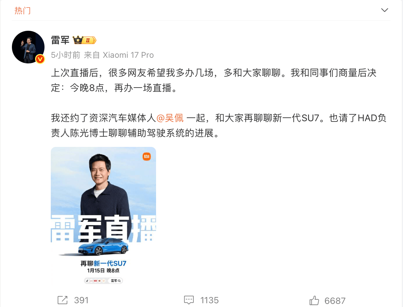 雷軍今晚8點再開直播 攜陳光博士詳解SU7及輔助駕駛新進展