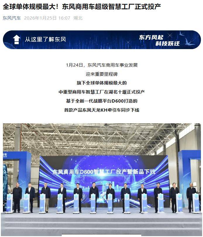 東風汽車在商用車領域迎來重大突破,其位于湖北十堰的全球最大中重型商用車智慧工廠正式啟動運營。這座以數字化、智能化為核心的新型工廠,同步下線了基于D600戰略平臺打造的首款產品——東風天龍KH牽引車,標志著東風新一代商用車平臺進入規模化量產階段。