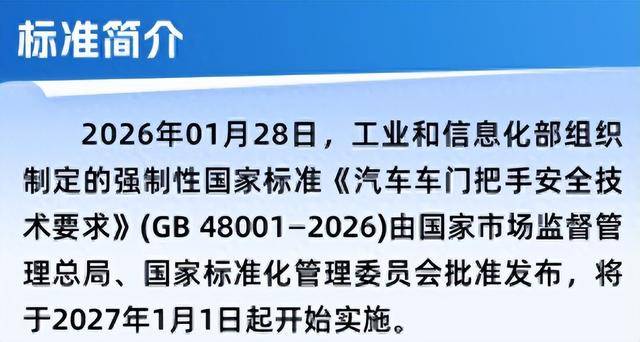 為規范車門把手設計,工業和信息化部于2026年1月28日發布了強制性國家標準《汽車車門把手安全技術要求》(GB 48001-2026)。該標準明確要求,每個車門(不含背門)必須配備機械釋放車門外把手,確保在安全氣囊展開或動力電池熱擴散等緊急情況下,乘客仍能通過機械方式開啟車門。同時,車內也需配備至少一個獨立操作的機械釋放內把手,且安裝位置需直觀可見、無遮擋。