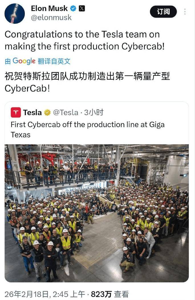 特斯拉在美國(guó)得州超級(jí)工廠迎來(lái)重要里程碑——首輛量產(chǎn)型Cybercab正式下線。公司首席執(zhí)行官埃隆?馬斯克通過(guò)社交平臺(tái)發(fā)文,向研發(fā)團(tuán)隊(duì)致以祝賀。這款完全取消方向盤(pán)與踏板的車(chē)型,標(biāo)志著特斯拉在無(wú)人駕駛出租車(chē)商業(yè)化領(lǐng)域邁出實(shí)質(zhì)性步伐,全球出行方式或?qū)⒁虼擞瓉?lái)顛覆性變革。