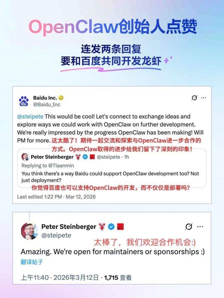 國際開發(fā)者社區(qū)對此給予高度關(guān)注。同日,OpenClaw創(chuàng)始人Peter Steinberger在社交平臺連續(xù)發(fā)布兩條動態(tài),盛贊中國AI領域的創(chuàng)新效率,并主動提出與百度開展技術(shù)合作。這位知名開發(fā)者表示,中國團隊在移動端AI應用開發(fā)方面展現(xiàn)出的技術(shù)敏銳度值得全球同行借鑒。