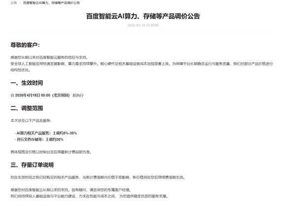 百度智能云在公告中指出,此次價格調(diào)整涉及AI算力服務與并行文件存儲兩大產(chǎn)品線。其中,算力服務價格將上調(diào)5%至30%,存儲產(chǎn)品價格上調(diào)幅度約為30%。公司特別說明,已購買服務的用戶在當前計費周期內(nèi)不受影響,新價格僅適用于后續(xù)續(xù)費場景。這一調(diào)整被視為應對全球AI算力需求激增與硬件成本攀升的雙重壓力。