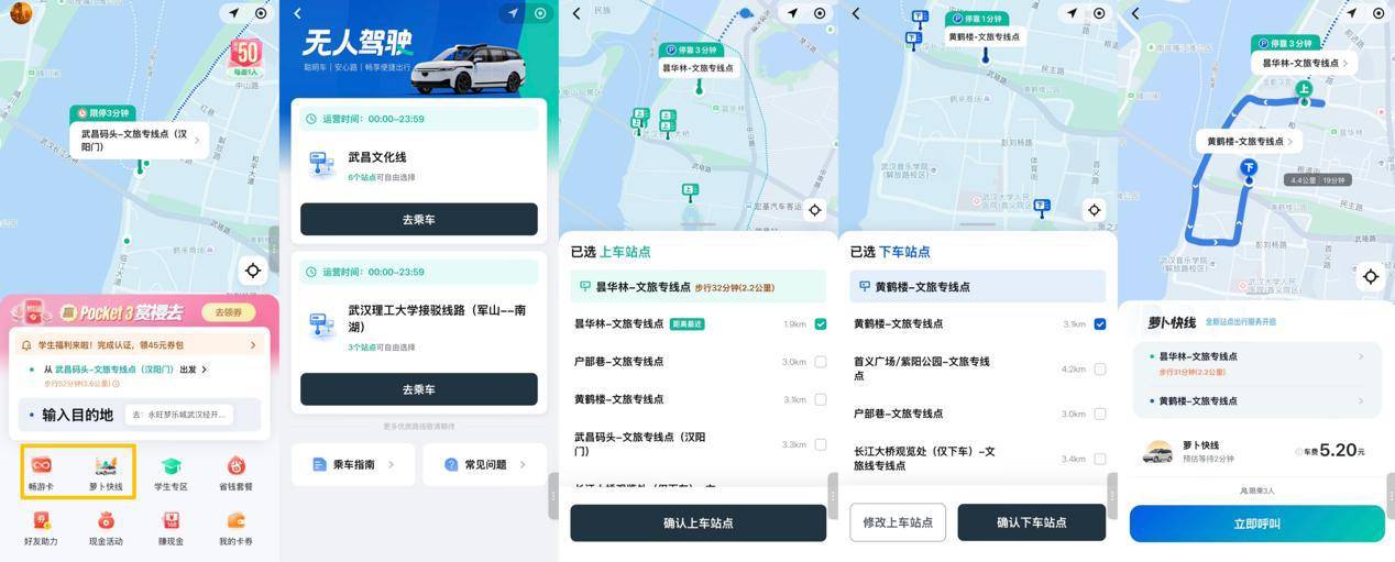 使用“蘿卜快線”十分便捷,游客只需打開蘿卜快跑 APP 或微信小程序,點擊“蘿卜快線”,手機界面便會呈現(xiàn)各城市特色主題路線。選好上車點和下車點,就能坐上無人車打卡城市特色景點。3 月 16 日,“蘿卜快線”上線暢游日卡全天通票功能,市民和游客可以一口價不限次乘坐,直達景點,讓春游出行更加省心。