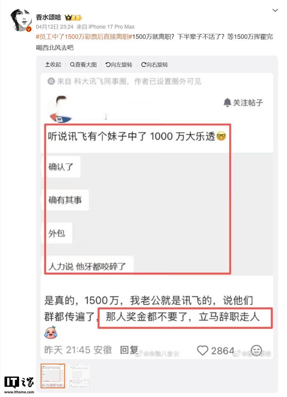 近日,一則關(guān)于“科大訊飛員工喜中巨額彩票”的傳聞在網(wǎng)絡(luò)上引發(fā)廣泛關(guān)注。盡管中獎(jiǎng)金額存在不同說(shuō)法,但相關(guān)話題迅速登上微博熱搜榜,截至目前閱讀量已突破1.4億次,成為網(wǎng)友熱議的焦點(diǎn)。