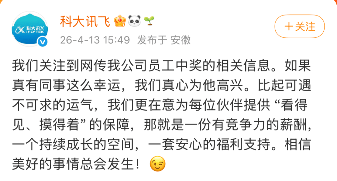 科大訊飛員工中1500萬(wàn)彩票后離職?公司回應(yīng):若屬實(shí)真心為他高興
