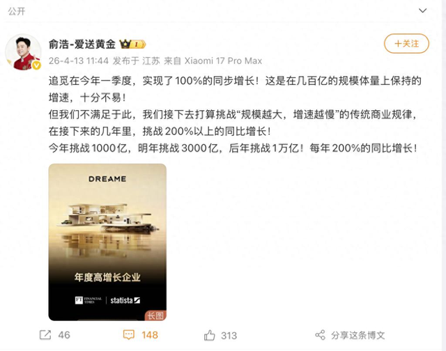 2026年4月13日,俞浩帶著追覓一季度100%的增長數據回歸微博,喊出今年挑戰1000億的目標,這不是狂妄,是一個中國創業者,對自己、對時代、對中國科技力量的篤定。