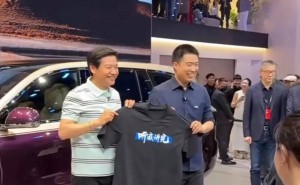 雷軍車展互動送李想“聽我講完”T恤