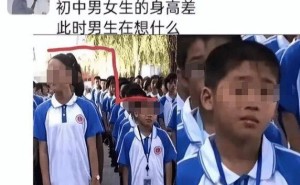 只見所有學生們站成一排,一般學生在操場上列隊的時候,老師會要求大個在前小個在后,于是幾乎所有的女生都站在了前面,男生站在了后面,而男生和女生之間的分界線,身高差了不止一個頭。 這個男生剛入學的時候真是太矮了…